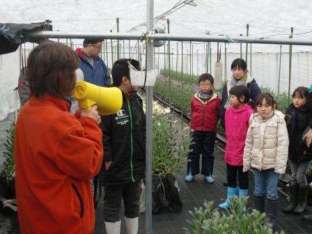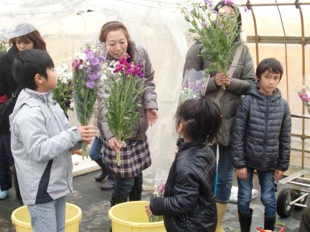 午後からは、農事組合法人市原地区布引営農組合のみなさんを講師に、キャベツやお花のお話を聞きました。お花の摘み取り体験では、バランスのよい花とするための摘心作業を教えていただいたり、出荷の時と同様に4色をまとめて花束をつくりました。